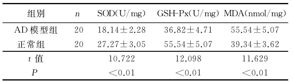 與正常組對(duì)應(yīng)的3個(gè)指標(biāo)比較, AD模型組SOD、GSH-Px活性明顯降低, 而MDA含量明顯升高。詳見(jiàn)表1。
