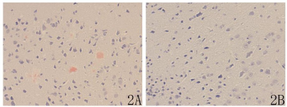剛果紅染色, AD模型組海馬CA2區(qū)細(xì)胞外可見(jiàn)多個(gè)Aβ斑, 染成淡紅色, 在其周圍可能有浸潤(rùn)的膠質(zhì)細(xì)胞及變性神經(jīng)細(xì)胞染成藍(lán)色, 背景清晰 (圖2A) ;而正常組錐體細(xì)胞結(jié)構(gòu)清晰, 未見(jiàn)Aβ斑 (圖2B) 。
