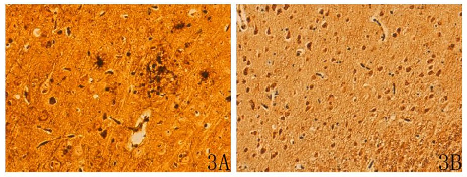 改良Bielschowsky氨銀液染色結(jié)果:AD模型組海馬CA2區(qū)可見(jiàn)錐體細(xì)胞排列不整齊、稀疏、萎縮、核固縮, 核周體內(nèi)棕黑色細(xì)絲增粗、呈小塊狀;軸突內(nèi)神經(jīng)元纖維模糊不清;神經(jīng)元外可見(jiàn)Aβ斑或老年斑, 體積較大、數(shù)量較多, 且周圍有浸潤(rùn)的膠質(zhì)細(xì)胞及變性的神經(jīng)元 (圖3A) 。正常組海馬CA2區(qū)錐體細(xì)胞的細(xì)胞質(zhì)內(nèi), 可清晰地看到棕黑色的細(xì)絲狀結(jié)構(gòu)即神經(jīng)原纖維, 在核周體內(nèi)交織成網(wǎng), 并伸入樹(shù)突和軸突;神經(jīng)元外未見(jiàn)Aβ斑或老年斑 (圖3B) 。詳見(jiàn)圖3。